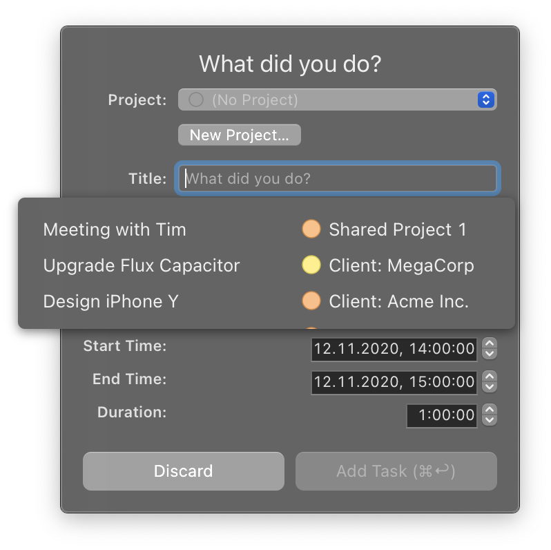 When you return to your Mac after a break, Timing's idle detection automatically prompts you to log what you've been working on.