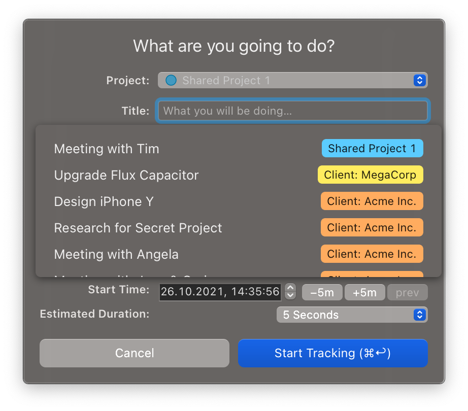 Alternativ können Sie rückwirkend Zeiten aus der Bildschirmzeit zuweisen oder Zeit basierend auf Kalenderereignissen erfassen, wenn Sie wieder an Ihrem Mac sind.