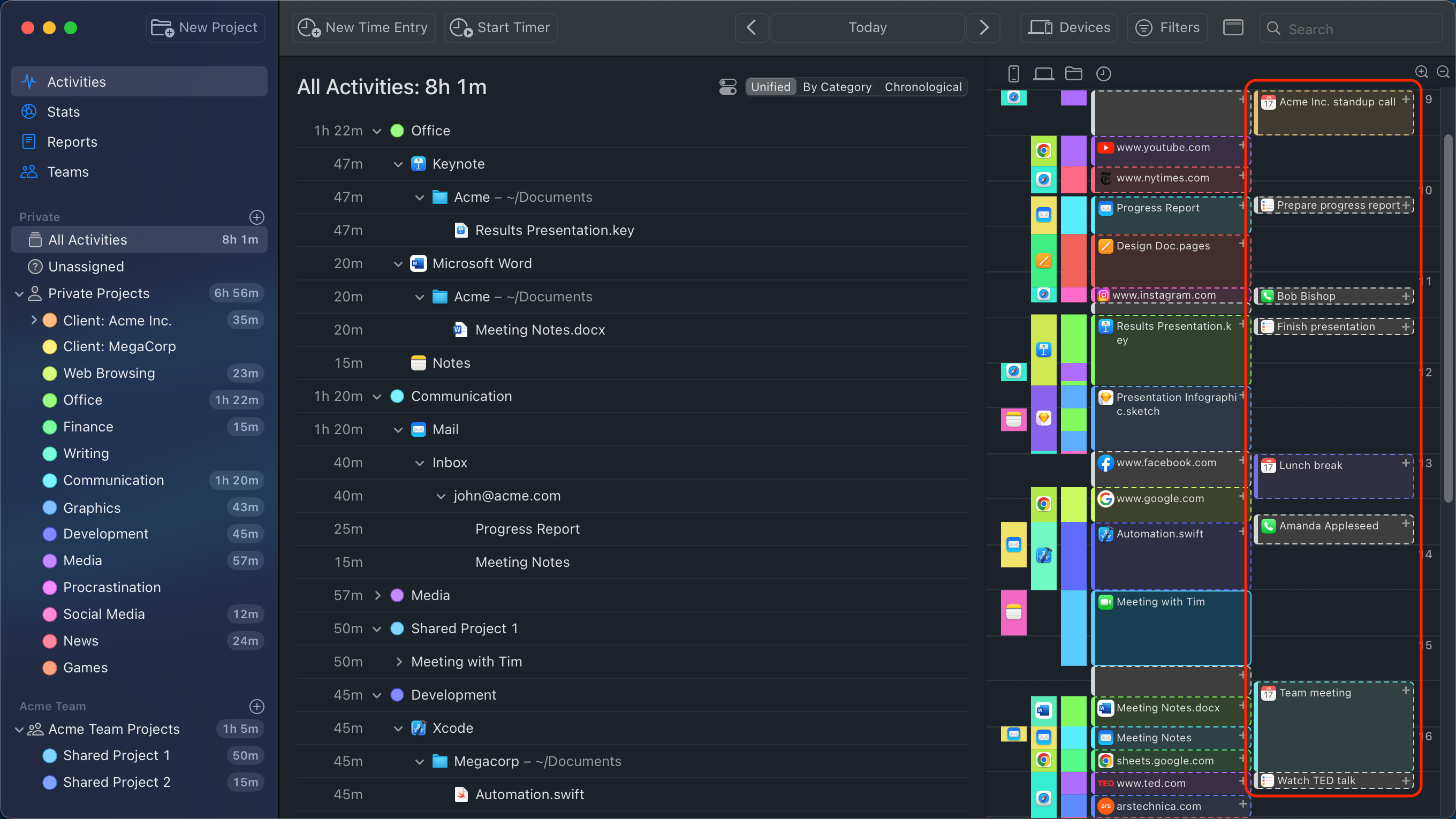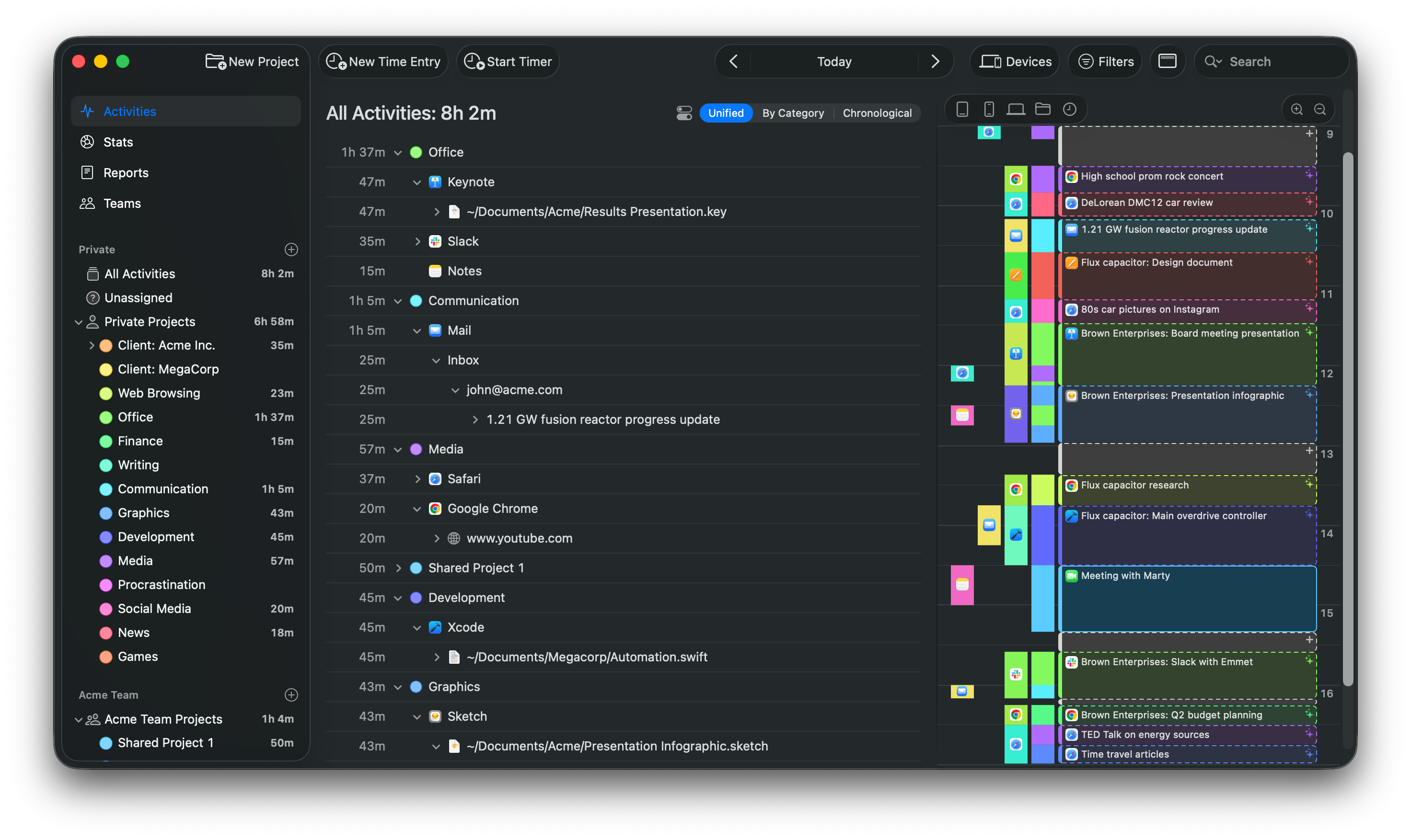 Con el tiempo, Timing te ahorrará horas de esfuerzo de categorización manual, sin mencionar todo el tiempo que normalmente gastarías iniciando y deteniendo cronómetros manuales.