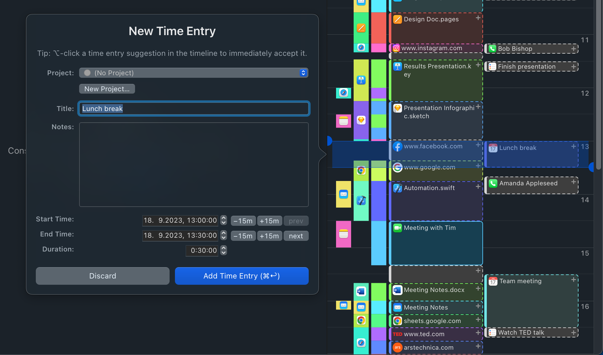No todo tu trabajo sucede frente a la computadora. La línea de tiempo interactiva de Timing hace que sea fácil agregar "tiempo fuera de línea" como reuniones con solo unos pocos clics.