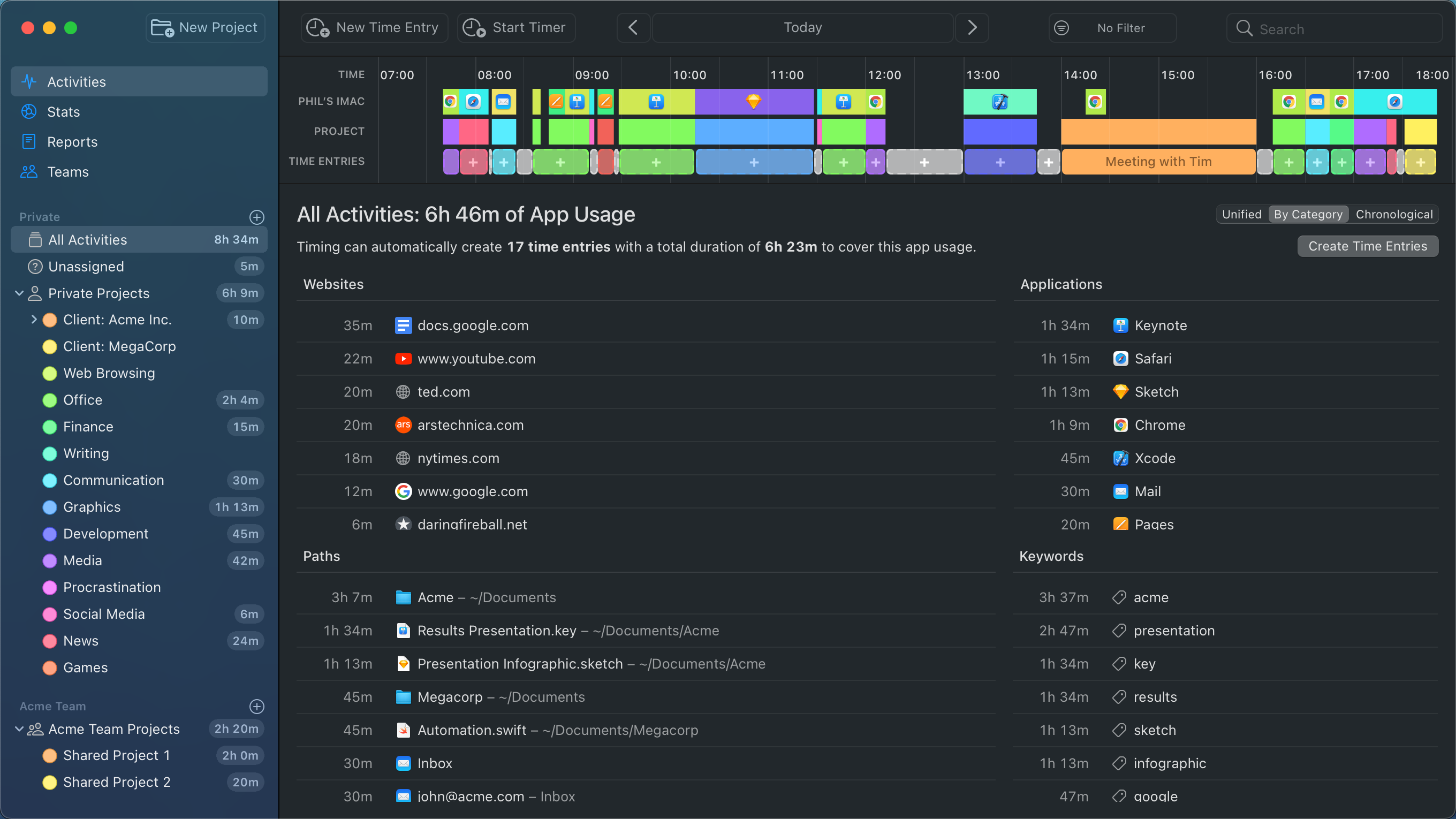 Note that this can contain any kind of folders — those for files but also, say, mailboxes. - Keywords. Timing automatically extracts common words from the window titles and paths it tracks.