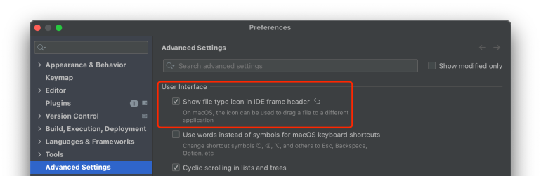 By default, the IDEs developed by JetBrains do not report the path of the currently edited document. However, if you enable the Show file type icon in IDE frame header option in the Advanced Settings ▶ User Interface section of your IDE's preferences, Timing will be able to pick up the current document's path from the IDE's window icon: