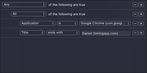 This is particularly useful when combined with other rules. For example, you could create a rule that assigns all browser activity on weekends to a "Personal" project, while browser activity during weekdays gets assigned to "Work".