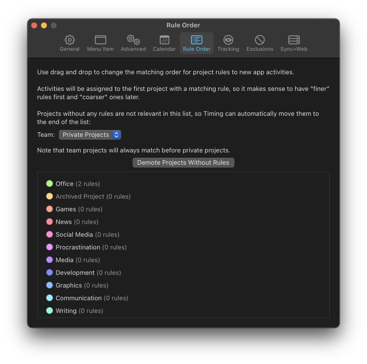 - When re-applying a single project's rules, Timing will still evaluate all project rules — it only changes the activity's project if no higher-priority rule also matches.