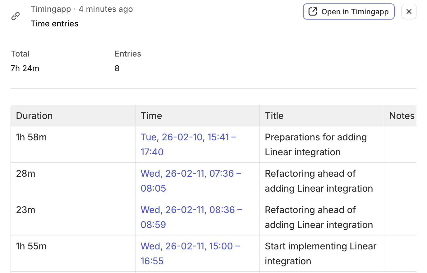 然后你可以毫不费力地将这些时间无缝同步回 Linear。