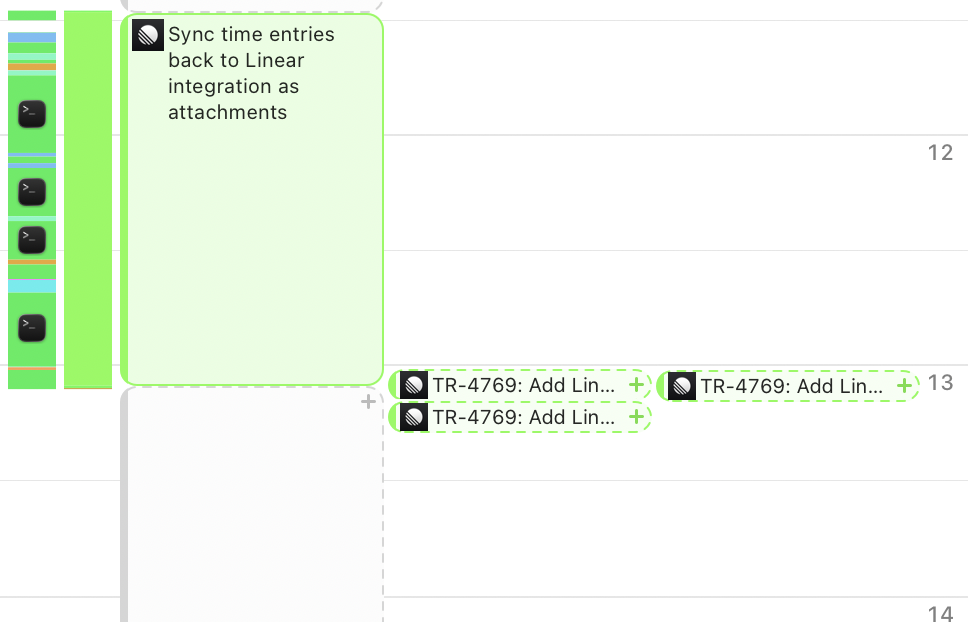 几分钟内,Mac 上的 Timing 应用就会在时间线上显示分配给你的 Linear 议题。此外,当你在 Timing 中创建新的时间条目时,可以在自动补全列表中选择你的 Linear 议题。
